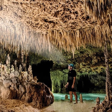 Combinaison, casque et lampe, et c’est parti pour l’exploration ! Vous suivrez le guide spécialisé dans les eaux cristallines de la rivière souterraine, à travers des stalactites et stalagmites de milliers d’années.